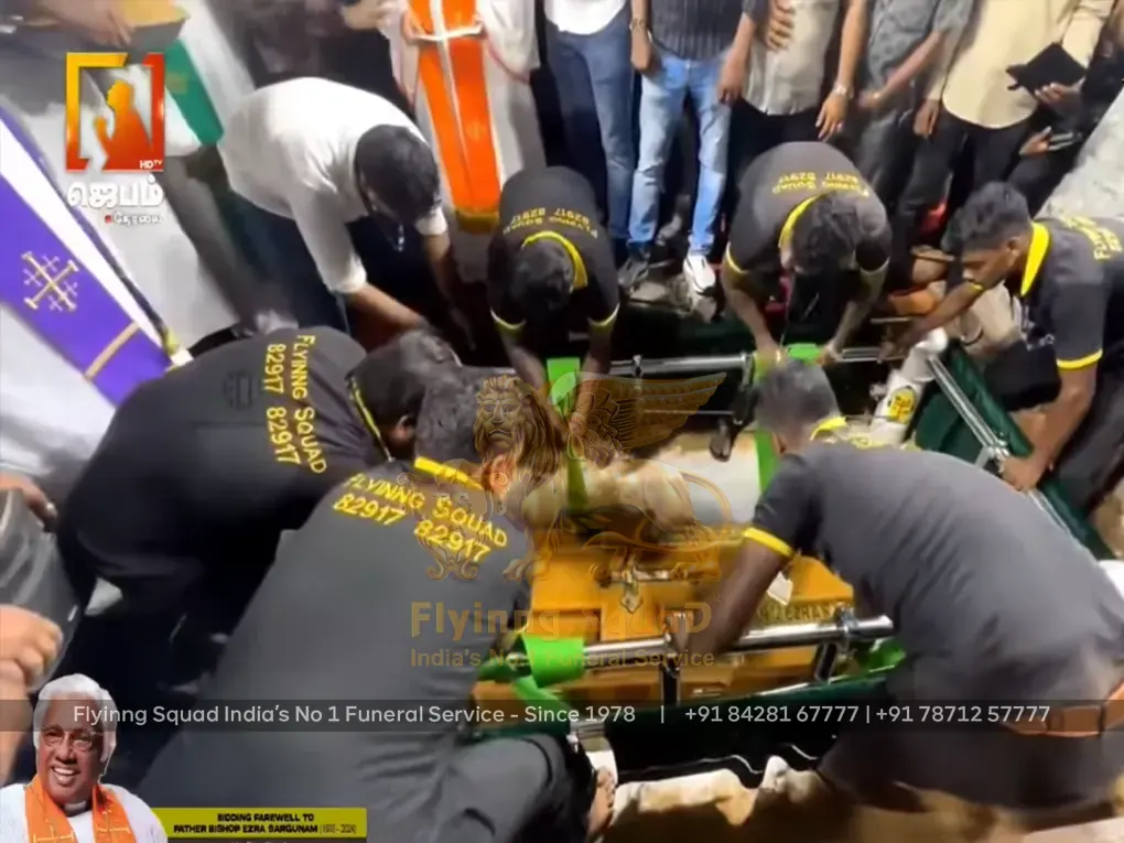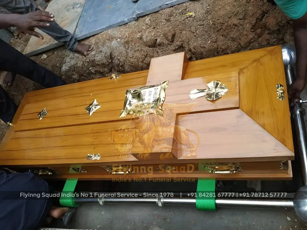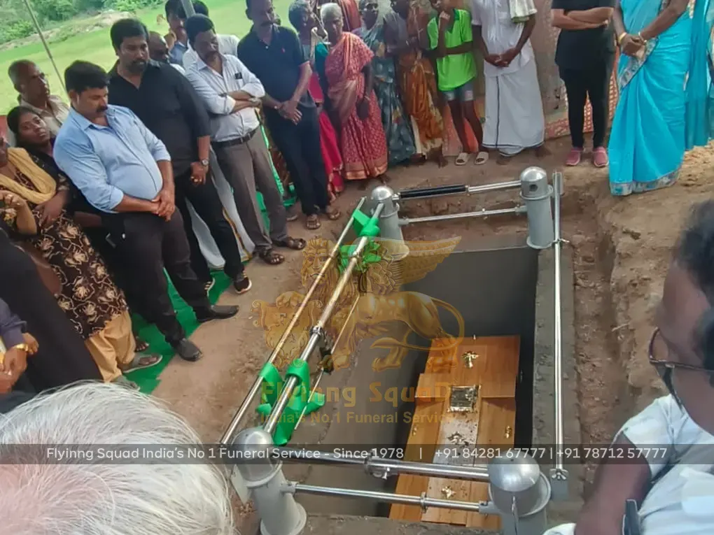 The funeral services at Flyinng Squad benefit from our coffin trolleys and casket lowering devices, which ensure dignified proceedings during burials. Our coffin trolley offers easy and honorable transportation through its secure design, facilitating smooth coffin movement during funeral services. This robust device is made from durable materials that can be handled effortlessly during operations at home, church, or crematorium.